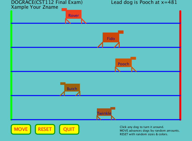 Dog properties: name, color, width & height of body (rectangle); coordinates (x,y); plus other values and booleans as needed. Each dog has random size (50-100 wide), and random (brownish) color.