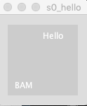 // 0_hello.pde: My first sketch // Author: B.A.Martin text( "Hello", 50, 20 ); text( "BAM", 10,90 ); //